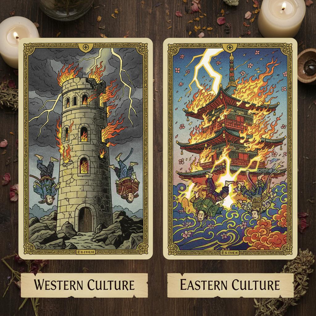 Choć motyw Wieży jest uniwersalny, różne talie przedstawiają ją na własny sposób. W tradycji marsylskiej jest to prosta, niemal surowa budowla, podczas gdy w talii Rider-Waite-Smith Wieża eksploduje pod wpływem pioruna, a ludzie spadają w otchłań. W kulturach Wschodu symbole katastrofy bywają łagodniejsze — częściej odwołują się do cykliczności natury, destrukcji prowadzącej do odrodzenia. Współczesne talie alternatywne, jak Tarot Osho Zen czy Tarot Nowej Ery, stawiają na metaforę przebudzenia, nie tylko końca.