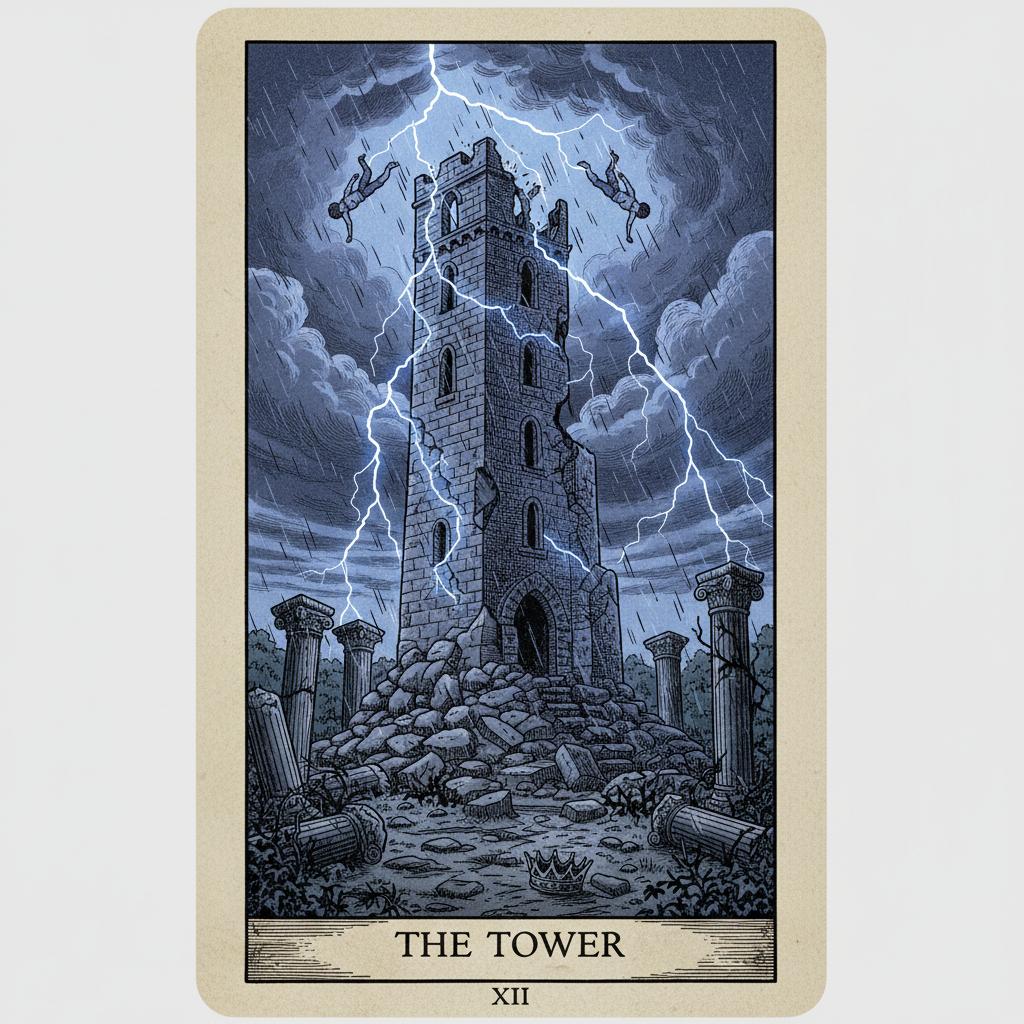 Symbolizuje nagłe i nieoczekiwane zmiany, które prowadzą do destrukcji starych struktur — zarówno wewnętrznych, jak i zewnętrznych.