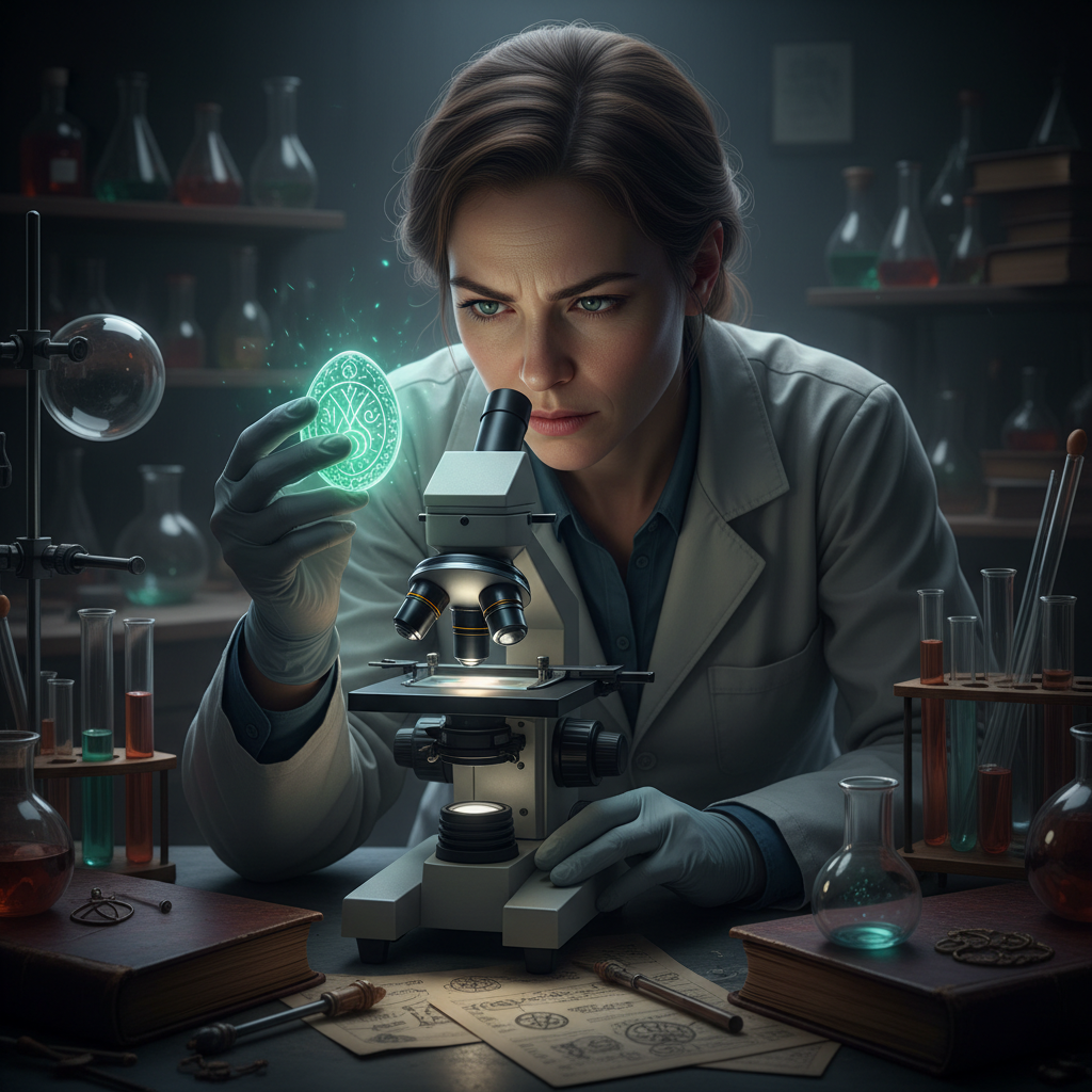 Zdjęcie: Naukowiec analizujący talizman pod mikroskopem, podkreślający sceptyczne podejście nauki.