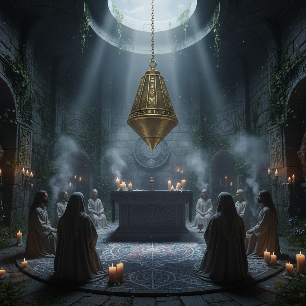 Zdjęcie przedstawia historyczne wahadełko podczas rytuału – przykład wykorzystania tej techniki przez dawnych mistrzów wróżbiarstwa. Słowa kluczowe: jak wróżyć z wahadełka, historia wahadełka.