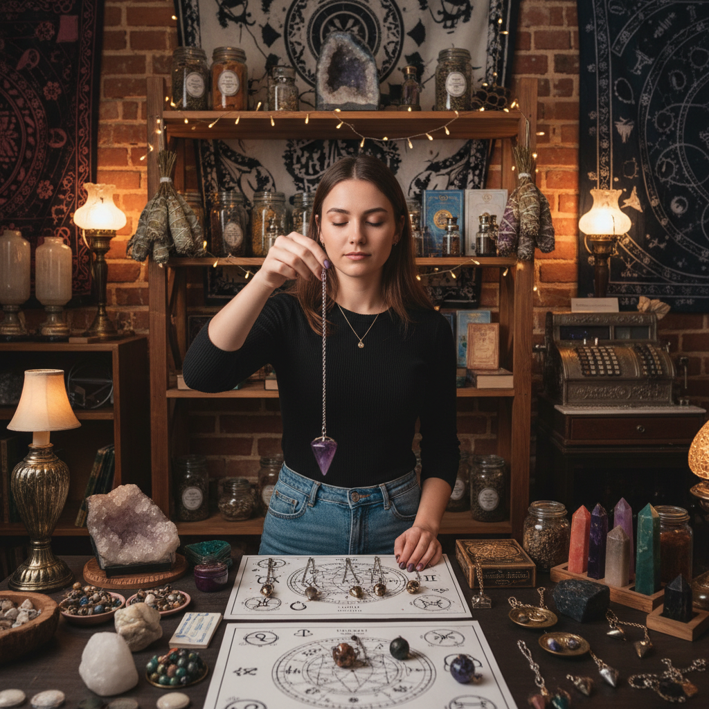 Zdjęcie przedstawia osobę wybierającą wahadełko w sklepie ezoterycznym – kluczowy moment dla początkujących wróżbitów. Słowa kluczowe: wybór wahadełka, jak wróżyć z wahadełka.