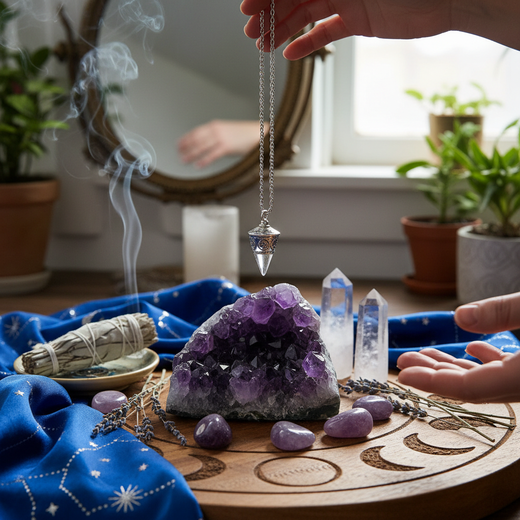 - Oczyść wahadełko: Przetrzyj je pod bieżącą wodą lub połóż na kamieniu neutralizującym energię (np. ametyst, selenit).