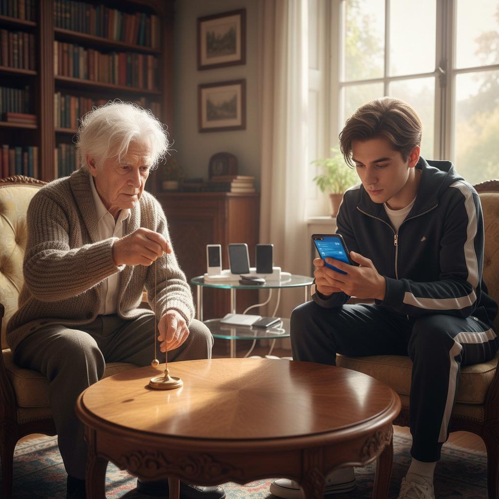 Zdjęcie przedstawia starszą osobę z klasycznym wahadełkiem i młodą osobę ze smartfonem – symbol spotkania tradycji z technologią. Słowa kluczowe: tradycyjne wróżby, mistycyzm, cyfrowa transformacja.