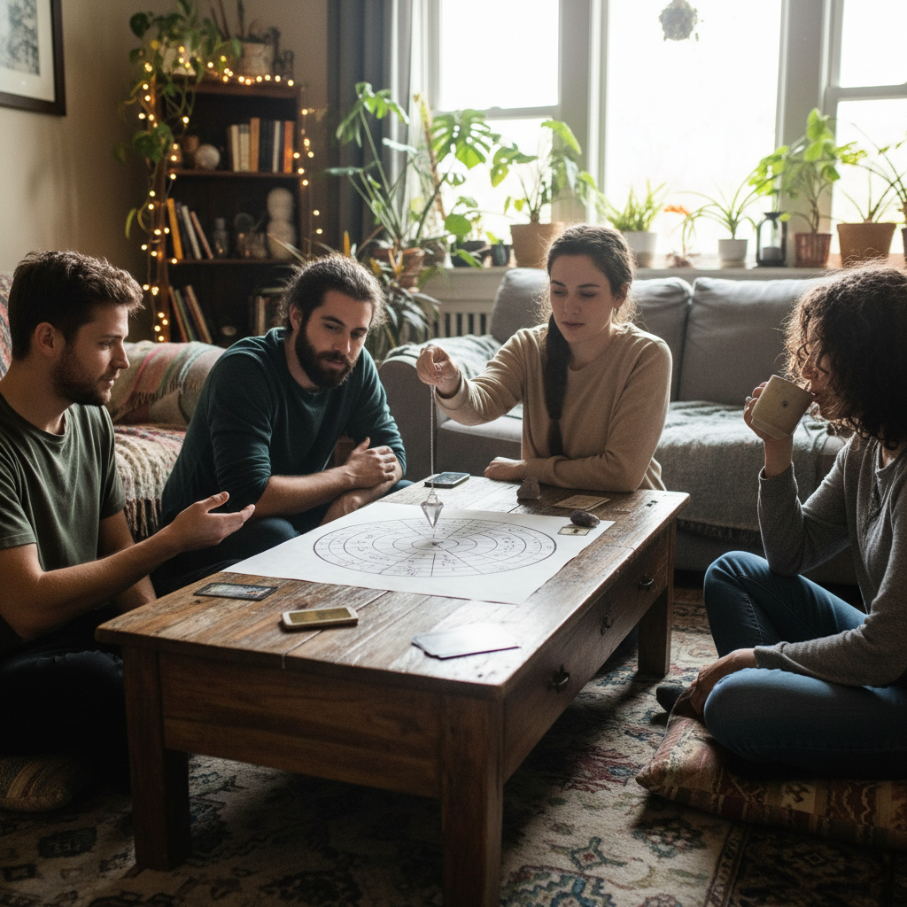 Zdjęcie przedstawia grupę młodych osób podczas domowej sesji wróżenia z wahadełka. Słowa kluczowe: wahadełko w kulturze, wróżenie online, jak wróżyć z wahadełka.
